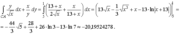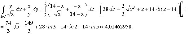 Уравнение стороны ВС: x + y − 14 = 0 запишем в виде уравнения прямой с угловым коэффициентом y = - x + 14. Применяя метод вычисления криволинейного интеграла второго рода в декартовых координатах, будем иметь