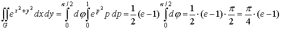 Видно, что в области G радиус r изменяется в пределах от 0 до 1, а угол φ — от 0 до π. Иначе говоря, область G преобразуется в прямоугольник {( π, φ) | 0 ≤ r ≤ 1; 0 ≤ φ ≤ π / 2}.