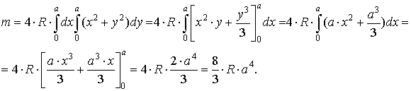 П р и м е р 5. Определить массу квадратной пластинки со стороной 2· а, если плотность ρ(х, у) в каждой точке М(х, у) пропорциональна квадрату расстояния от точки М до точки пересечения диагоналей, и коэффициент пропорциональности равен R.