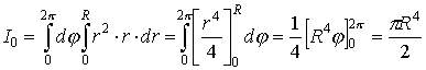 П р и м е р 7. Найти момент инерции круга радиуса R с постоянной плотностью ρ(х, у) = 1 относительно начала координат.