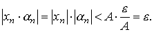 Доказательство. Пусть {xn} – ограниченная, а {αn} – бесконечно малая последовательности. Требуется доказать, что последовательность{xn·αn} бесконечно малая. Так как последовательность {xn} ограничена, то существует число А > 0 такое, что любой элемент числовой последовательности {xn} удовлетворяет неравенству | xn| ≤ A. Возьмем любое как угодно малое положительное число ε > 0. Поскольку последовательность {αn} бесконечно малая, то для любого как угодно малого положительного числа ε/ A существует номер N такой, что при всех n > N выполняется неравенство