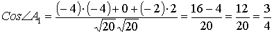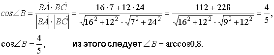 Используя формулу косинуса угла через скалярное произведение, получим далее величину косинуса угла между этими векторами