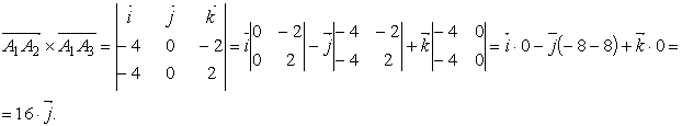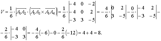 Объём пирамиды А1А2А3А4 найдём через смешанное произведение векторов, исходящих через вершину А1 (1.4), (1.6) и