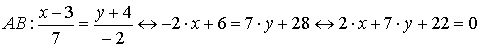 векторов этих высот n1(7; – 2) и n2(2; – 7). Так как стороны треугольника АВ и АС должны быть перпендикулярными этим высотам то для вывода уравнения этих сторон воспользуемся формой уравнения прямой, проходящей через данную точку в данном направлении: