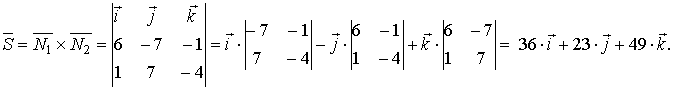 Р е ш е н и е. N1 = (6; − 7; − 1), N2 = ( 1; 7; − 4) — нормальные векторы этих плоскостей. Тогда S – направляющий вектор искомой прямой найдём через векторное произведение нормальных векторов