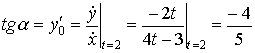 Р е ш е н и е. Геометрический смысл производной состоит в том, что производная функции в данной точке равна тангенсу угла наклона касательной, проведённой к графику функции в данной точке. Найдём производную функции, заданной параметрически, при данном значении параметра t = 2