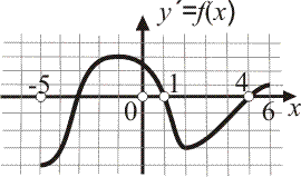 Функция y = f (x) определена на промежутке x ( − 5; 6 ). На рисунке указан график производной. Укажите промежутки убывания функции y = f (x). |