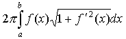 | Пусть кривая АВ задана уравнением y = f (x), а ≤ х ≤ b, и пусть функция y = f (x) неотрицательна и непрерывна вместе со своей первой производной на отрезке [а, b]. Тогда поверхность, образованная вращением кривой АВ вокруг оси ОХ, имеет площадь S, которая может быть вычислена по формуле |