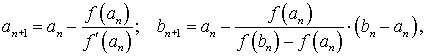 N an bn bn - an f(an) f(bn) f'(an) f(bn) -f(an) h1n h2n 0 -2 -1 1 -1 8 16 9 0,0625 0,11111 1 -1,9375 -1,88889 0,04861 -0,03101 0,68038 15,0117 0,71139 -0,00207 -0,00212 2 -1,93543 -1,93962 -0,00418 -3,3E-05 -0,06285 14,97946 -0,06281 -2,2E-06 -2,2E-06 3 -1,93544 -1,93544 - Аналогично находятся корень на отрезке х2 ∈ [1, 2]. Для расчётов на этом интервале применяем те же формулы.