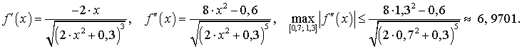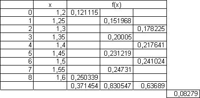 Р е ш е н и е. Согласно условию n = 8, поэтому h = (b – a)/n = (1,6 – 1,2)/8 = 0,05. Вычислительная формула имеет вид