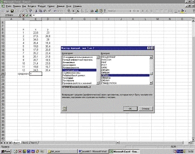 - c) в появившемся диалоговом окне на поле ''категория'' выбрать ''статистические'', в поле функция выбрать ''СРЕДЗНАЧ'';