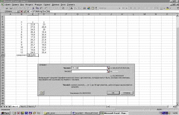 - d) в появившемся диалоговом окне на поле ''число 1'' отметить диапазон чисел, для которых следует найти среднее арифметическое.