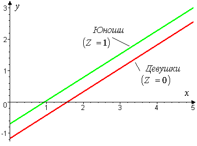 (5)Из (5) следует, что при том же числе решенных задач на вступительных экзаменах Х, юноши на проверочных экзаменах в среднем решают на 0,466 задачи больше. (На рисунке) показаны линии регрессии Y по Х для юношей z = 1 ( у = - 0,699 + 0,743·х) и девушек z = 0 ( у = - 1,165 + 0,743·х)