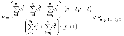 Критерий Г. Чоу может быть использован при построении регрессионных моделей при воздействии качественных признаков, когда имеется возможность разделения совокупности наблюдений по степени воздействия этого фактора на отдельные группы и требуется установить возможность использования единой регрессионной модели.
