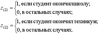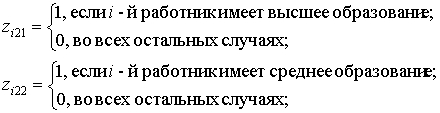 В рассматриваемом примере для учета фактора образования можно было в регрессионную модель (2) ввести k - 1 = 3 - 1 = 2 бинарные переменные Z21 и Z22