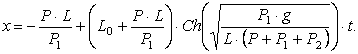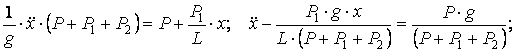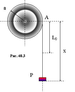 П р и м е р 48,3.(м) Определить движение груза Р, висящего на однородном тросе весом Р1 и длиной L трос навёрнут на барабан радиуса а и весом Р2; ось вращения горизонтальна; трением пренебрегаем; массу барабана считаем равномерно