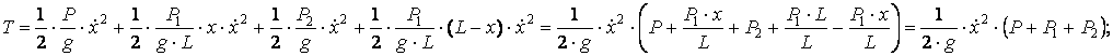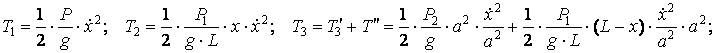 Кинетическая энергия системы будет состоять из трёх слагаемых: T = T1 + T2 + T3, где T1 – кинетическая энергия груза Р, T2 – кинетическая энергия свесившейся части каната, T3 – кинетическая энергия барабана вместе с намотанным на него тросом: T3 = T3′ + T3″