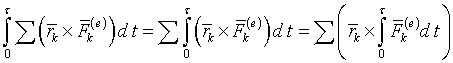 Левая часть этого равенства характеризует изменение кинетического момента системы относительно точки О за время удара. Обозначим это изменение Δ K0 . Правую часть равенства преобразуем, изменив порядок суммирования и интегрирования и вынеся потом rk за знак интеграла. Перемещением точек системы за время удара пренебрегаем и, следовательно, вектор rk в промежутке интегрирования (0, τ), постоянный. Таким образом, для правой части равенства