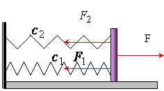 - Параллельное соединение. При параллельном соединении пружин все пружины имеют одинаковое удлинение, F = F1 + F2, c·x = c1·x + c2·x. Откуда имеем c = c1 + c2.
