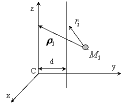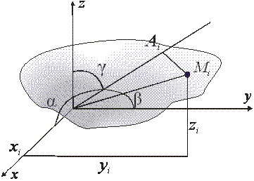 Из Δ OMiAi имеем ri² = OMi² - OAi². Обозначив координаты точки Мi относительно координатных осей x, y, z через xi, yi, zi имеем OMi² = xi² + yi² + zi². Отрезок ОAi есть проекция отрезка ОМi на ось L. Воспользовавшись сведения из аналитической геометрии, имеем