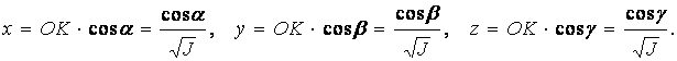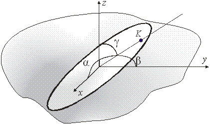 Возьмём какую- нибудь точку О в рассматриваемом теле и проведём через эту точку взаимно перпендикулярные оси x, y, z, а также ось L, образующую с осями x, y, z углы α, β, γ. обозначим момент инерции данного тела относительно оси L через J и отложим от точки О по оси L отрезок