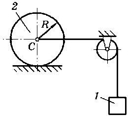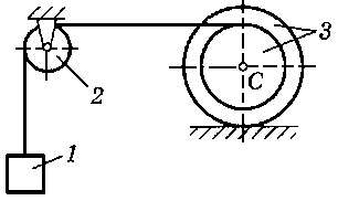 M = 180 H·м, m1 = 20 кг, m2 = 30 кг, m3 = 50 кг, R1 = 50 см, r2 = 25 см, R2 = 45 см, ρ2 = 35 см |