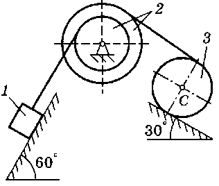 m2 = 2 m1, m3 = 4 m1, r2 = 30 см, R2 = 50 см, ρ2 = 40 см, f = 0,2, α = 30° |