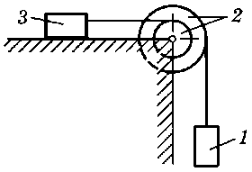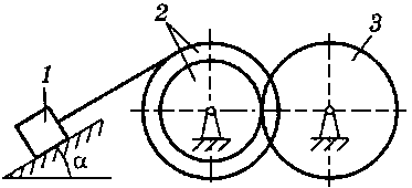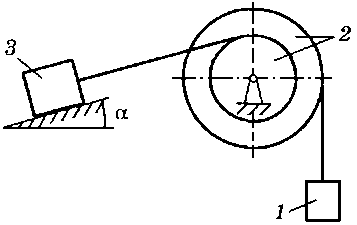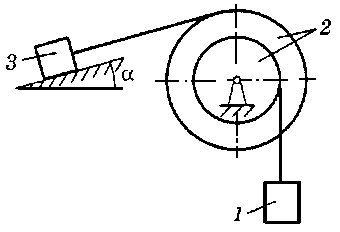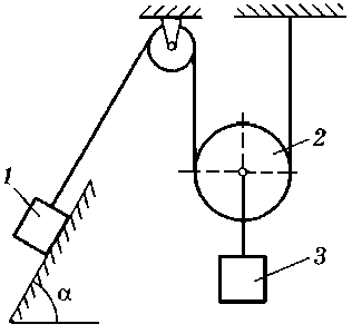 m2 = 1,5 m1, m3 = 6 m1, r2 = 20 см, R2 = 45 см, ρ2 = 30 см, f = 0,1, α = 15° |
