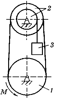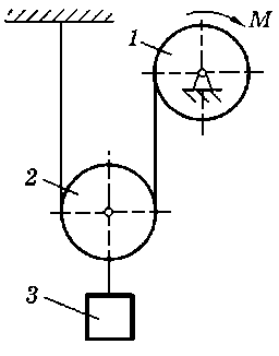 m1 = 20 кг, m2 = 10 кг, m3 = 40 кг, R1 = 30 см, М = 60 Н·м |
