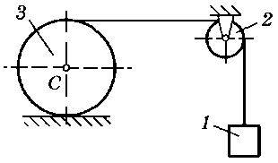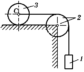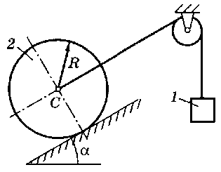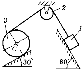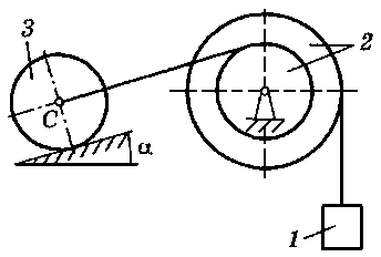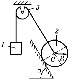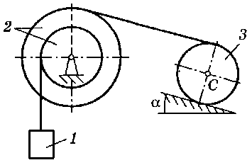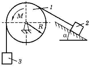 M = 70 H·м, m1 = 24 кг, m2 = 40 кг, m3 = 20 кг, R = 25 см, f = 0,12, α = 30° |