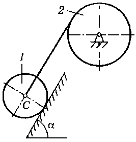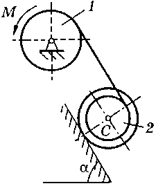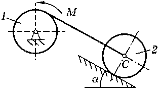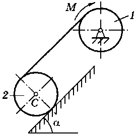 M = 120 H·м, m1 = 15 кг, m2 = 32 кг, R1 = 20 см, r2 = 15 см, R2 = 40 см, ρ2 = 20 см, α = 60° |