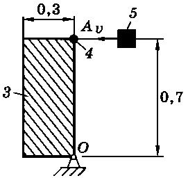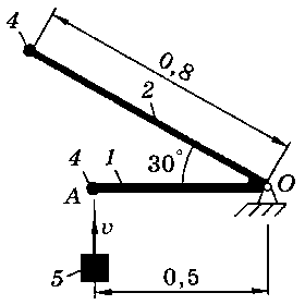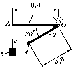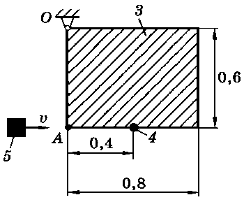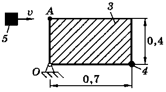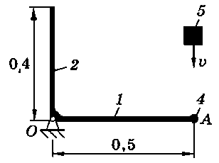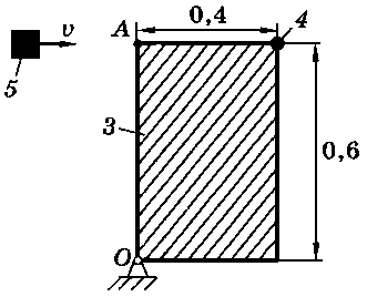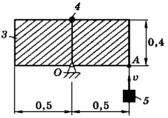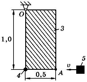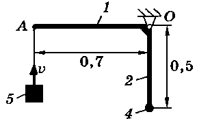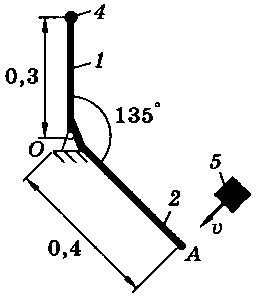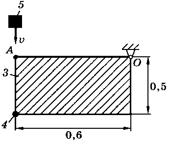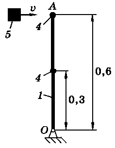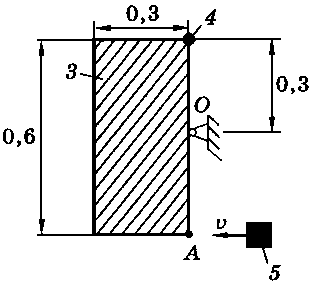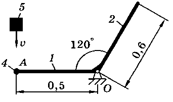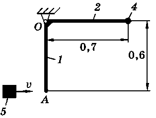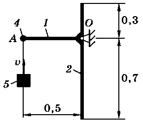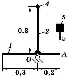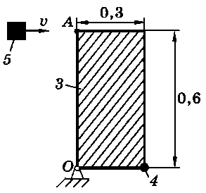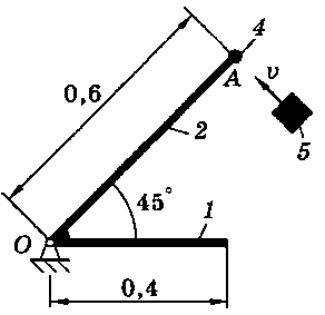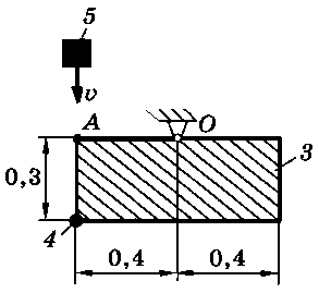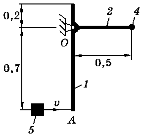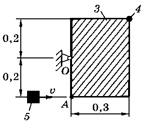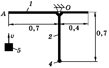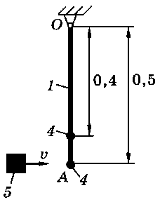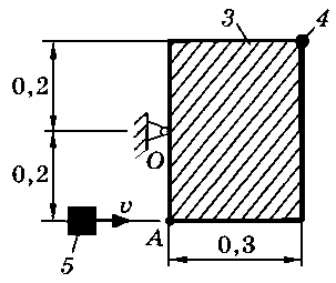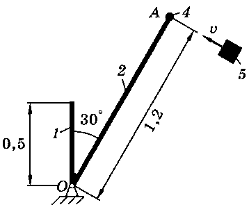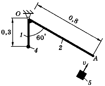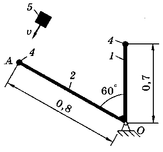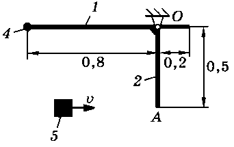 Тело 5 (материальная точка) массой m5 = 30 кг, двигаясь со скоростью v = 4 м/с, ударяется о неподвижную конструкцию в точке А, причем удар является абсолютно неупругим. Определить угловую скорость конструкции после удара и воспринимаемый ею ударный импульс. Найти также потерянную при ударе кинетическую энергию системы.