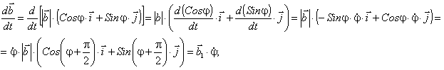 При дифференцировании вектора постоянной длины в плоскости вектор поворачивается против хода часовой стрелки, если смотреть с конца вектора угловой скорости, и умножается на угловую скорость поворота. Действительно, пусть вектор b есть вектор постоянной длины | b | = const. В неподвижной системе координат Oxy этот вектор может быть записан в виде b = | b |· ( cos φ·i + sin φ·j ). Далее, дифференцируя вектор b по времени, получим