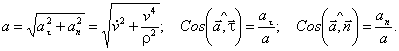 – нормальное ускорение. Так как составляющие нормального и касательного ускорения перпендикулярны, то по теореме Пифагора находим модуль и углы к касательной и нормали ускорения точки