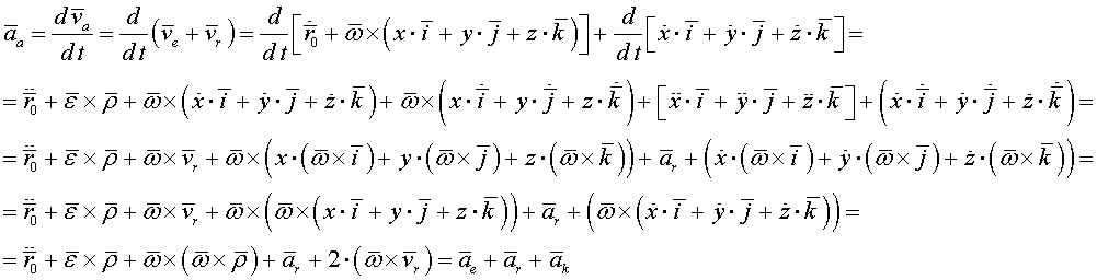 Это справедливо и для ускорений точек тела.Применяем теорему о сложении ускорений для каждой точки; при ускорение Кориолиса для каждой точки тела равно нулю, так как переносное движение является поступательным. Поскольку в каждом поступательном движении твердого тела ускорения всех точек в каждый момент времени тоже равны между собой, то и ускорения всех точек тела в его абсолютном движении равны между собой и это общее ускорение можно считать ускорением всего тела в данный момент времени. Обозначая a1, a2, aa относительное, переносное и абсолютное ускорения, имеем: