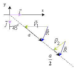 П р и м е р 1. Железнодорожный состав идёт курсом ЮВ со скоростью ''а'' км/ч, при этом ощущается ветер В. Состав уменьшает скорость до ½a км/ч, при этом ощущается ветер СВ. Определить направление и скорость ветра.