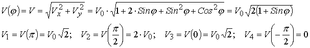 Из этого соотношения получим вырожение скорости для любой точки люлда колеса. В частности, для указанных точек на вертикальном и горизонтальном диаметре получим скорости v1, v2, v3, v4.