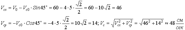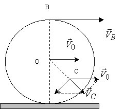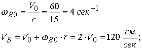 Колесо радиуса r = 15 см катится по горизонтальной плоскости со скоростью V0 = 60 см/сек. Найти скорости точек ''В'' и ''С'', если ОС = 5 см.Р е ш е н и е.