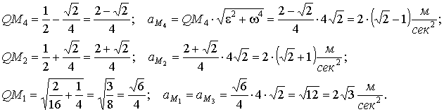 | Пример 2. Диск радиуса R = 0,5 м и r = 0,25 м катится со скоростью V0 = 1м/сек равнозамедленно с ускорением а0 = 2 м/сек2. Определить ускорения точек, находящихся на малом радиусе и на биссектрисах координатных четвертей. Решение. Найдём угловую скорость и угловое ускорение катящегося диска ![]() ![]() |