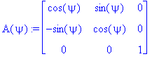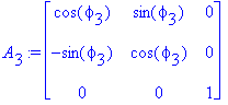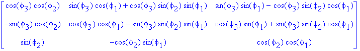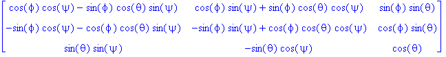 Переход от неподвижного базиса к базису, связанному с телом, осуществляется матрицей А2,1 = A(φ)·A(θ)·А(ψ): е2 = А2,1·е1. Выполняя последовательное умножение указанных матриц, найдём матрицу А2,1
