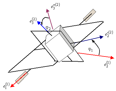 Рассматриваются два базиса: базис е2 жёстко связан с телом и базис е1 является неподвижным. Переход от базиса е1 к базису е2 осуществляется тремя последовательными поворотами ψ, θ, φ, последовательностью индесков осей поворотов является (3, 1, 3). Матрицы поворотов отпеределяются соотношениями