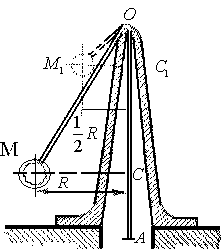 28.4. Гирька М привязана к концу нерастяжимой нити МОА, часть которой ОА пропущена через вертикальную трубку; гирька движется вокруг оси трубки по окружности радиуса МС = R, делая 120 об/мин. Медленно втягивая нить ОА в трубку, укорачивают наружную часть нити до длины ОМ1, при которой гирька описывает окружность радиусом R/2. Сколько оборотов в минуту делает гирька по этой окружности?