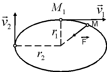 .28.8. Точка М движется вокруг неподвижного центра под действием силы притяжения к этому центру. Найти скорость v2 в наиболее удаленной от центра точке траектории, если скорость точки в наиболее близком к нему положении v1 = 30 см/с, а r2 в пять раз больше r1.