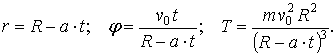28.14 . Шарик массы m, привязанный к нерастяжимой нити, скользит по гладкой горизонтальной плоскости; другой конец нити втягивают с постоянной скоростью а в отверстие, сделанное на плоскости. Определить движение шарика и натяжение нити Т, если известно, что в начальный момент нить расположена по прямой, расстояние между шариком и отверстием равно R, а проекция начальной скорости шарика на перпендикуляр к направлению нити равна vo.