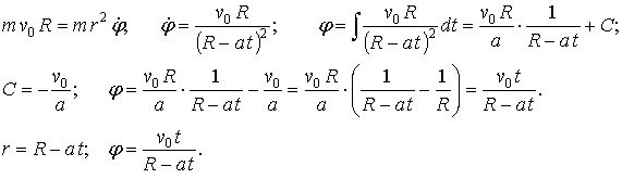 ; траектория — логарифмическая спираль.