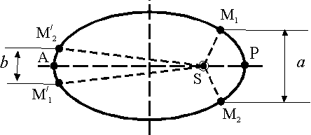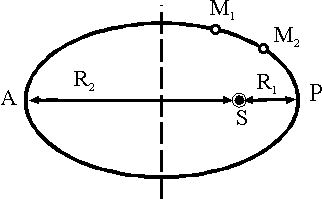 28.10. Два астероида M1 и М2 описывают один и тот же эллипс, в фокусе которого S находится Солнце. Расстояние между ними настолько мало, что дугу M1М2 эллипса можно считать отрезком прямой. Известно, что длина дуги M1М2 равнялась а, когда середина ее находилась в перигелии Р. Предполагая, что метеориты движутся с разными секториальными скоростями, определить длину дуги M1М2 , когда середина ее будет проходить через афелий А, если известно, что SP = R1 и SA = R2.