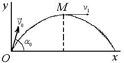 28.9. Найти импульс равнодействующей всех сил, действующих на снаряд за время, когда снаряд из начального положения О переходит в наивысшее положение М. Дано: v0 = 500 м/с; αо = 60°; v1 = 200 м/с; масса снаряда 100 кг.