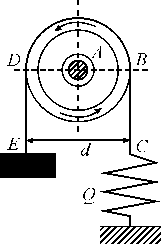 29.15. Для измерения мощности двигателя на его шкив А надета лента с деревянными колодками. Правая ветвь ВС ленты удерживается пружинными весами Q, а левая ее ветвь DE натягивается грузом. Определить мощность двигателя, если, вращаясь равномерно, он делает 120 об/мин; при этом пружинные весы показывают натяжение правой ветви ленты в 39,24 Н; масса груза равна 1 кг, диаметр шкива d = 63,6 см. Разность натяжений ветвей ВС и DE ленты равна силе, тормозящей шкив. Определить работу этой силы в 1 с.