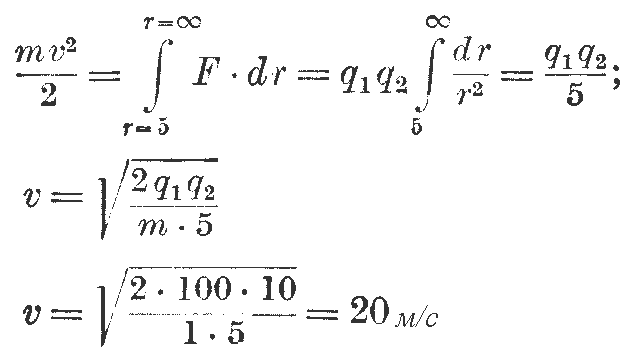30.24. Две частицы заряжены положительным электричеством, заряд первой частицы q1 = 100 Кл, заряд второй частицы q2 = 0,l q1, первая частица остается неподвижной, а вторая движется вследствие силы отталкивания от первой ча¬стицы. Масса второй частицы равна 1 кг, начальное расстояние от первой частицы равно 5 м, а начальная скорость равна нулю. Определить верхний предел для скорости движущейся частицы, принимая во внимание действие только одной силы отталкивания