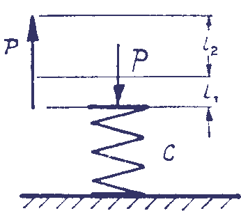 30.22. Горизонтальная пружина, на конце которой прикреплена материальная точка, сжата силой Р и находится в покое. Внезапно сила Р меняет направление на прямо противоположное. Определить, пренебрегая массой пружины, во сколько раз получающееся при этом наибольшее растяжение l2 больше первоначального сжатия l1.
